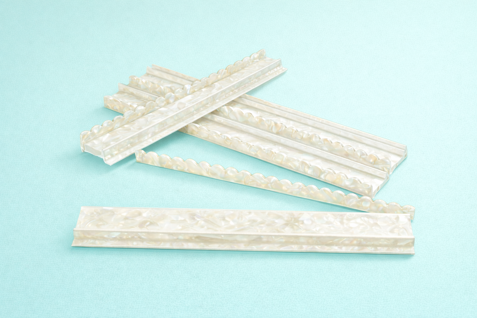 PRE-ORDER ONLY - SHIPPING FEBRUARY. Gorgeous mother of pearl patterned thick acrylic racks with magnetic scalloped pushers. 20” this length accommodates a large variety of tile styles. Set includes 4 racks and pushers.